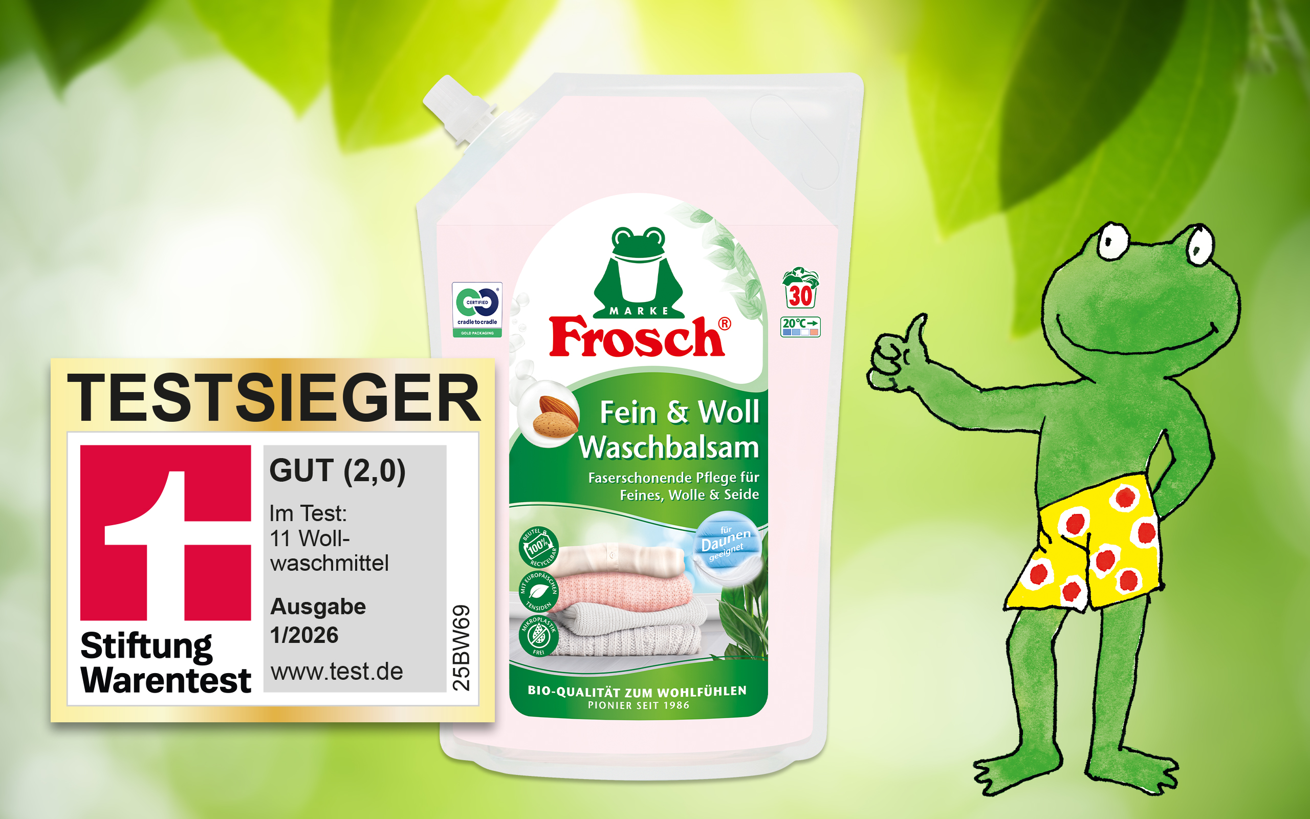 A sensational confirmation at year-end: The Frosch brand Delicate Almond Detergent is the winner of the wool detergent test conducted by Stiftung Warentest! The product, which was rated Good (2.0), cleans best, according to the testing institute, and treats wool, silk and fine washables gently.
