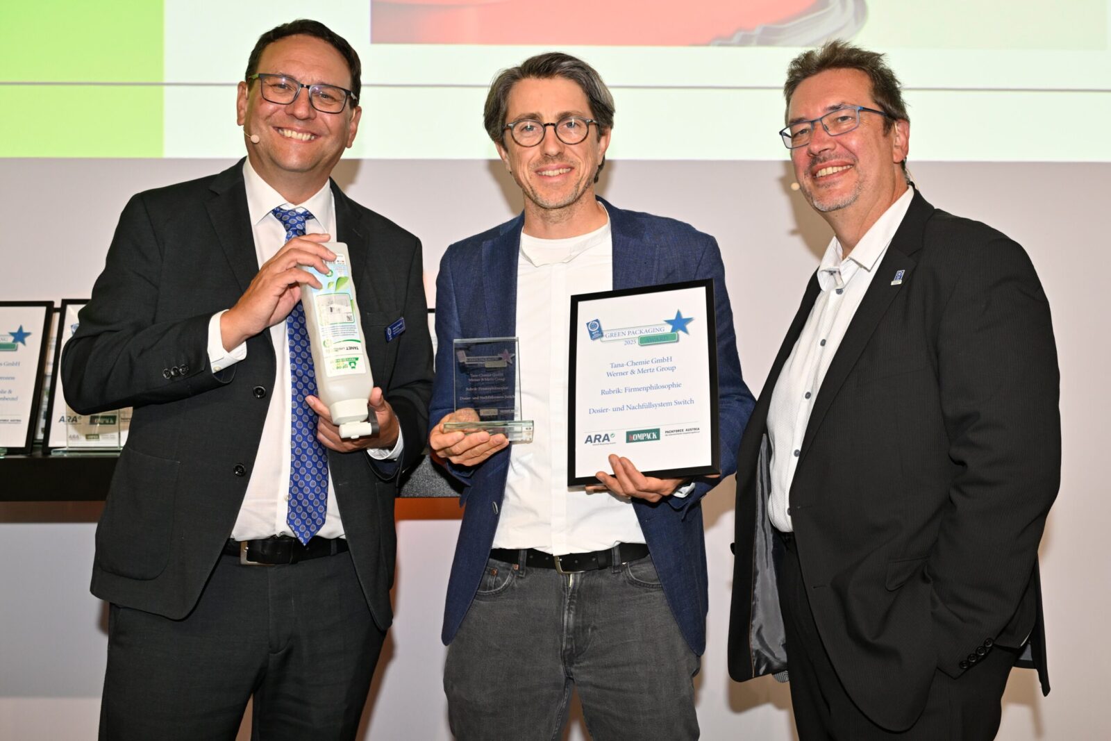 Werner & Mertz Professional received another prestigious award for its innovative dosing and refill system Switch. On the evening of September 24, 2025, the Green Packaging Star Award was presented for the 17th time. The Green Packaging Star Award recognizes particularly sustainable packaging solutions that protect not only the product but also the environment. It is presented annually at the FACHPACK packaging trade fair in Nuremberg, which has been the central meeting place for the packaging industry in Europe for over 40 years and offers a comprehensive program covering all relevant topics in the packaging industry. The award ceremony is organized by the WPO, the World Packaging Organization, and KOMPACK, the magazine for packaging and logistics solutions based in Austria.