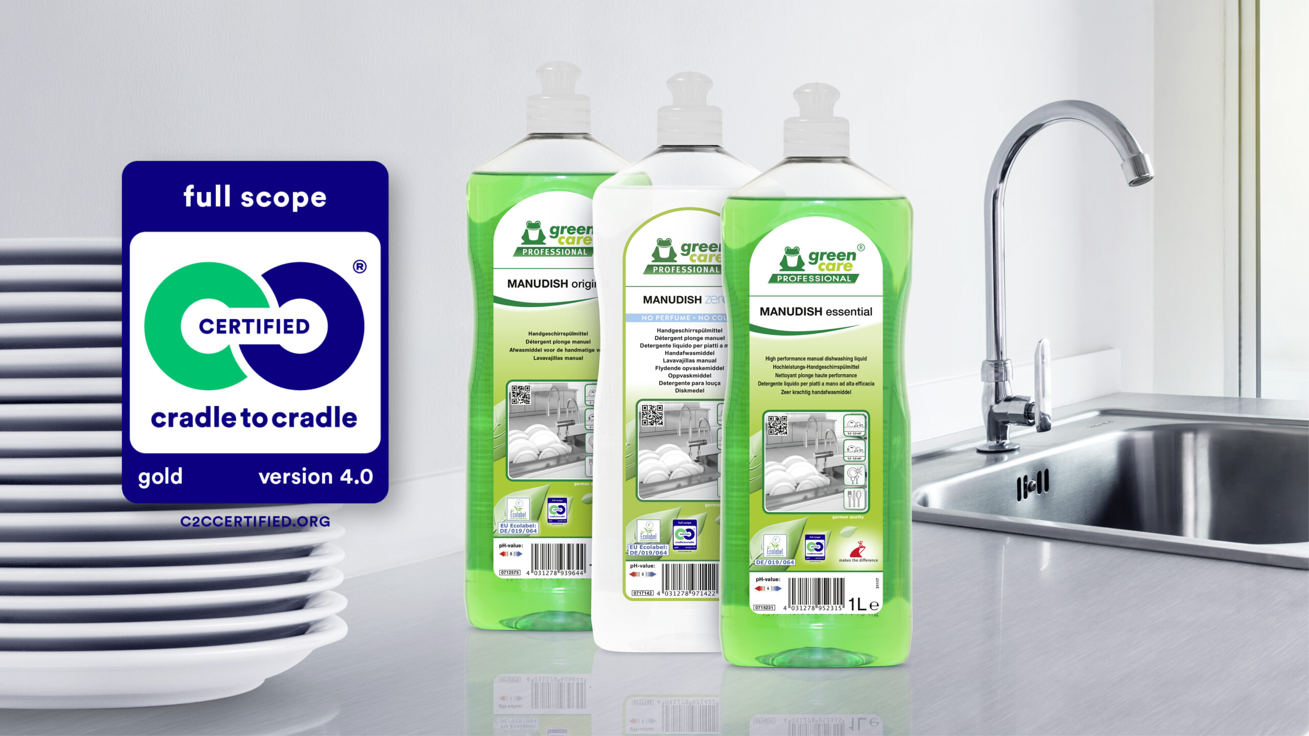 Record: Werner & Mertz Professional is the first cleaning products manufacturer in the world to have its products certified to the demanding Cradle to Cradle Certified® Standard 4.0 with Full Scope Gold. MANUDISH essential, MANUDISH original and MANUDISH zero% meet the highest requirements for Material Health, Product Circularity, Climate and Resource Protection, and Social Responsibility.