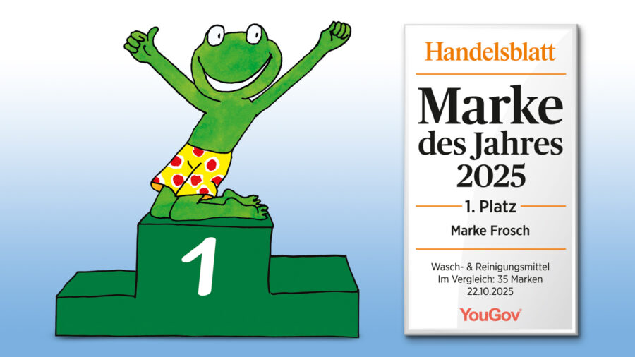 Der Mainzer Mittelständler Werner & Mertz setzt sich bei den Konsument*innen durch: In einem repräsentativen Ranking von YouGov in Kooperation mit dem Handelsblatt erzielte die Marke Frosch den ersten Platz in der Kategorie „Waschen und Reinigen“  –  noch vor bekannten Marken großer Unternehmen wie Persil und Ariel. Sie darf sich nun „Marke des Jahres“ nennen.
